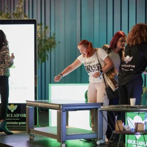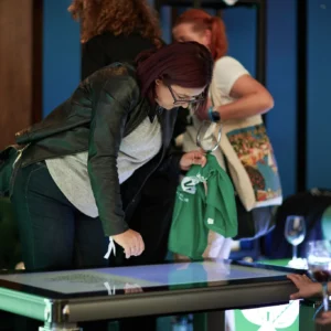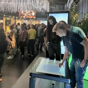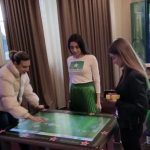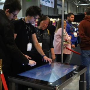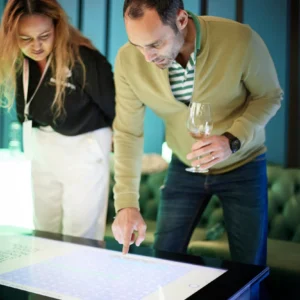 Masa interactivă cu touchscreen creează un punct de pornire în socializarea dintre invitați, având rolul unei mese tradiționale, de a aduce lumea la un loc. Poate fi utilizată în cadrul evenimentelor de orice fel, fiind un dispozitiv versatil și foarte atrăgător. Aceasta dispune de interfață Android, cu aplicații customizabile conform nevoii tale și personalizare cu elemente de identitate de brand (autocolant în părțile laterale).